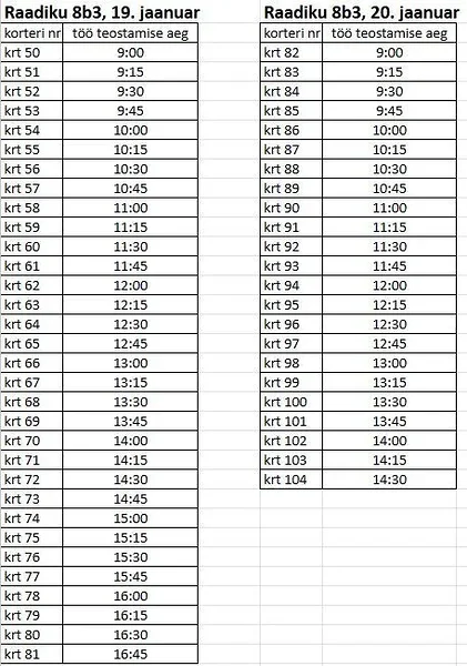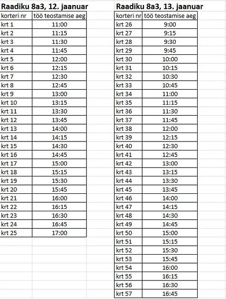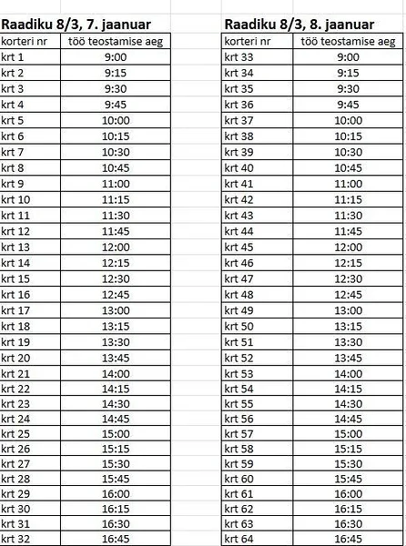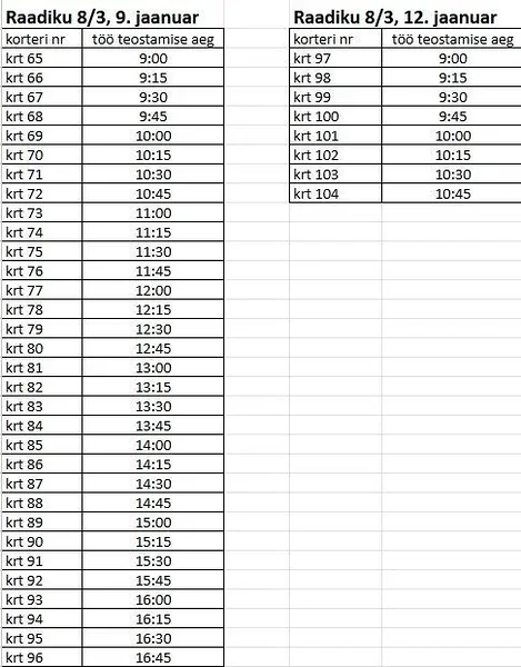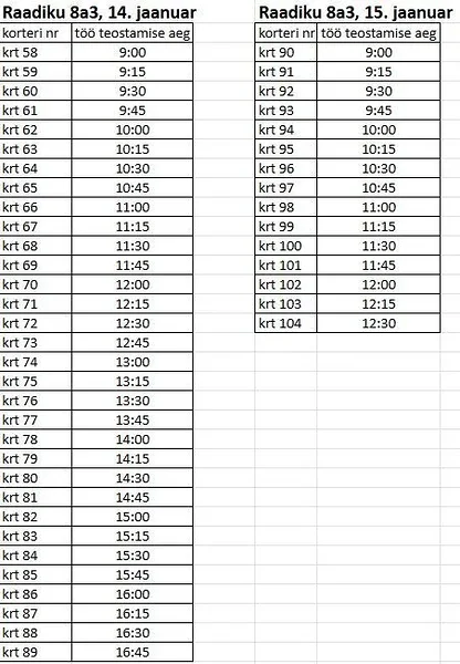 Tööd viiakse läbi vastavalt graafikule ning tööde kestvus ühes korteris on hinnanguliselt 15 min.