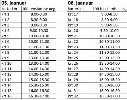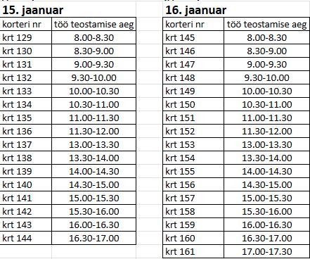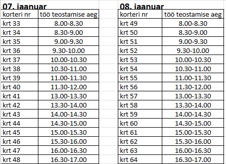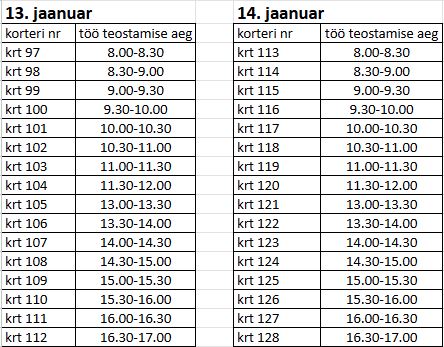 Tööd viiakse läbi vastavalt graafikule ning tööde kestvus ühes korteris on hinnanguliselt 30 min.