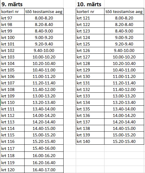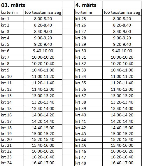 Tööd viiakse läbi vastavalt graafikule ning tööde kestvus ühes korteris on hinnanguliselt 20 min. Kõigil elanikel on vastavalt üürilepingule kohustus tagada korteritesse ligipääs .
