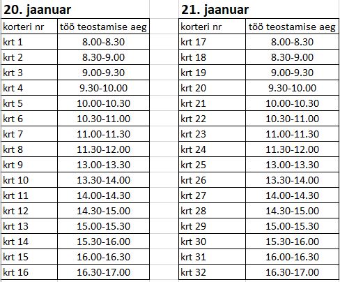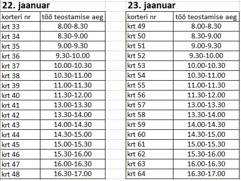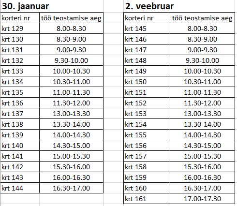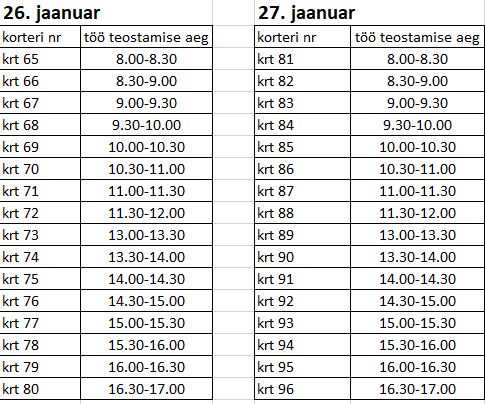 Tööd viiakse läbi vastavalt graafikule ning tööde kestvus ühes korteris on hinnanguliselt 30 min. Kõigil elanikel on vastavalt üürilepingule kohustus tagada korteritesse ligipääs .