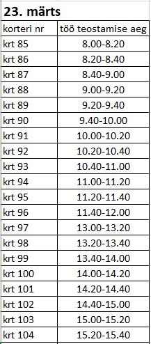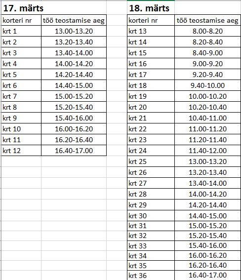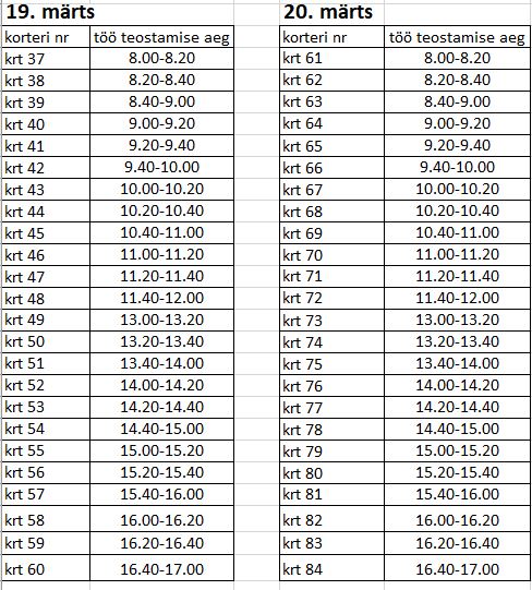 Tööd viiakse läbi vastavalt graafikule ning tööde kestvus ühes korteris on hinnanguliselt 20 min. Kõigil elanikel on vastavalt üürilepingule kohustus tagada korteritesse ligipääs .