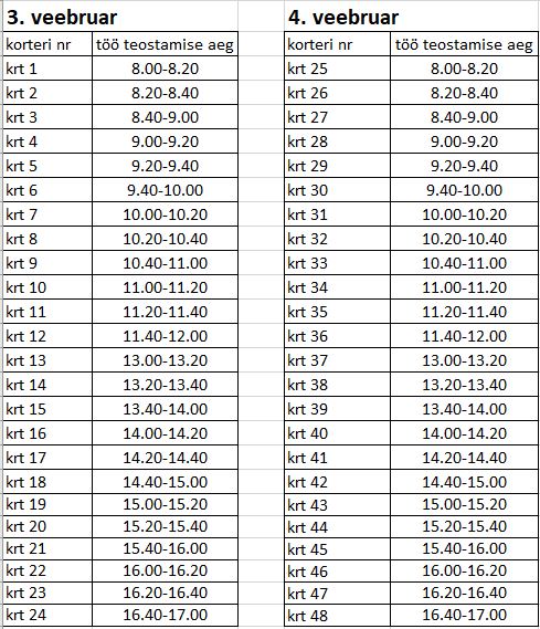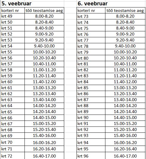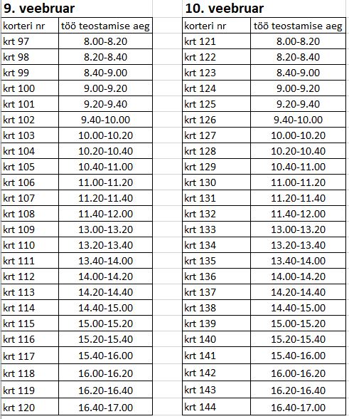 Tööd viiakse läbi vastavalt graafikule ning tööde kestvus ühes korteris on hinnanguliselt 30 min.
