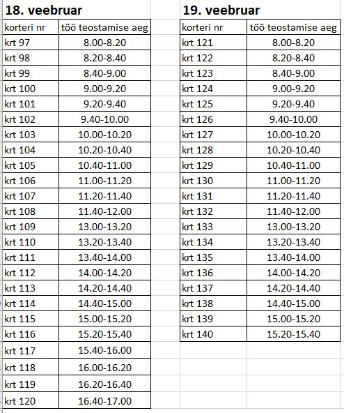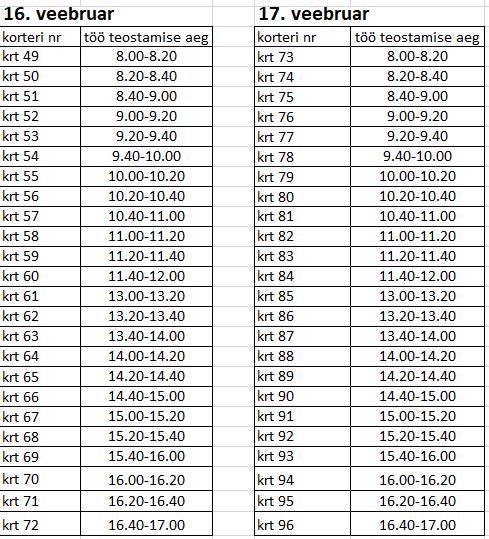 Tööd viiakse läbi vastavalt graafikule ning tööde kestvus ühes korteris on hinnanguliselt 20 min.